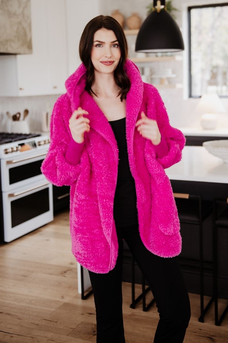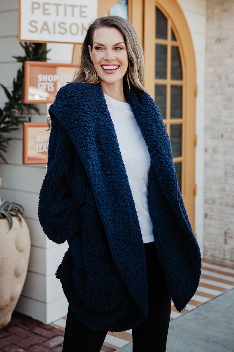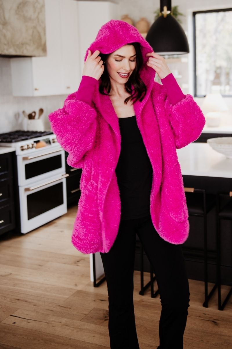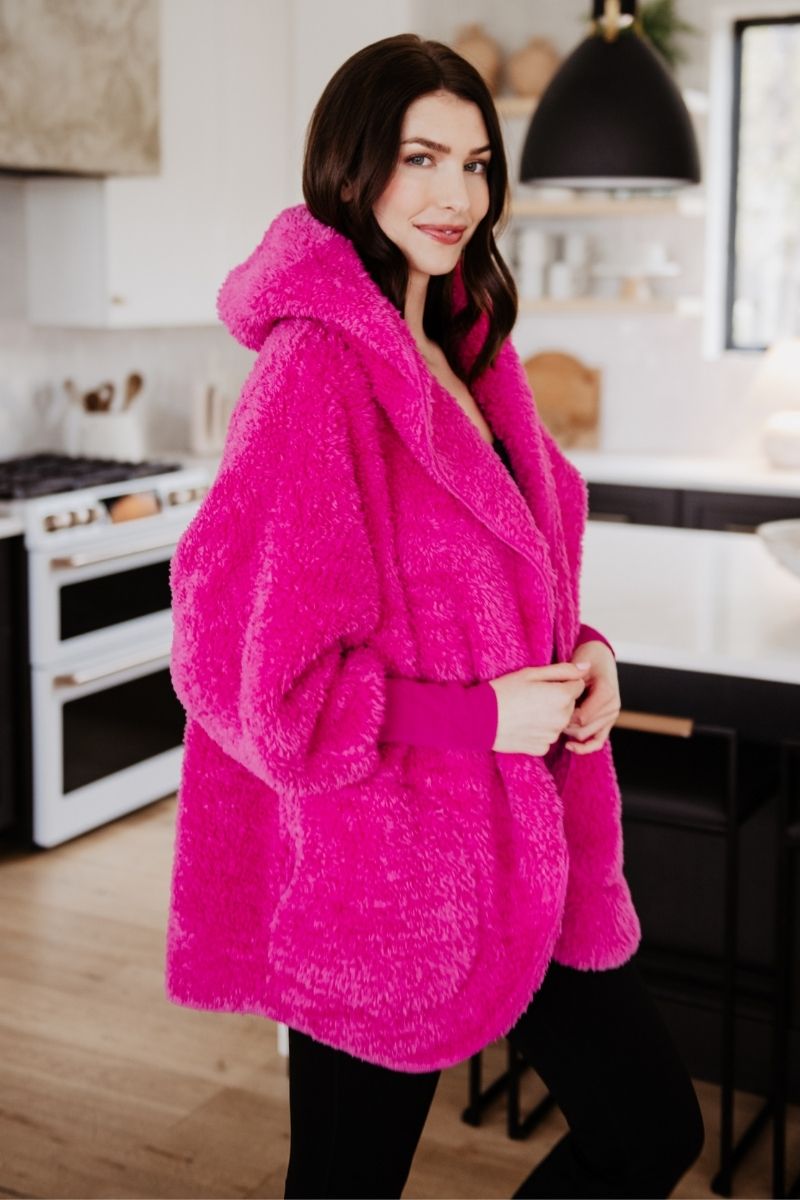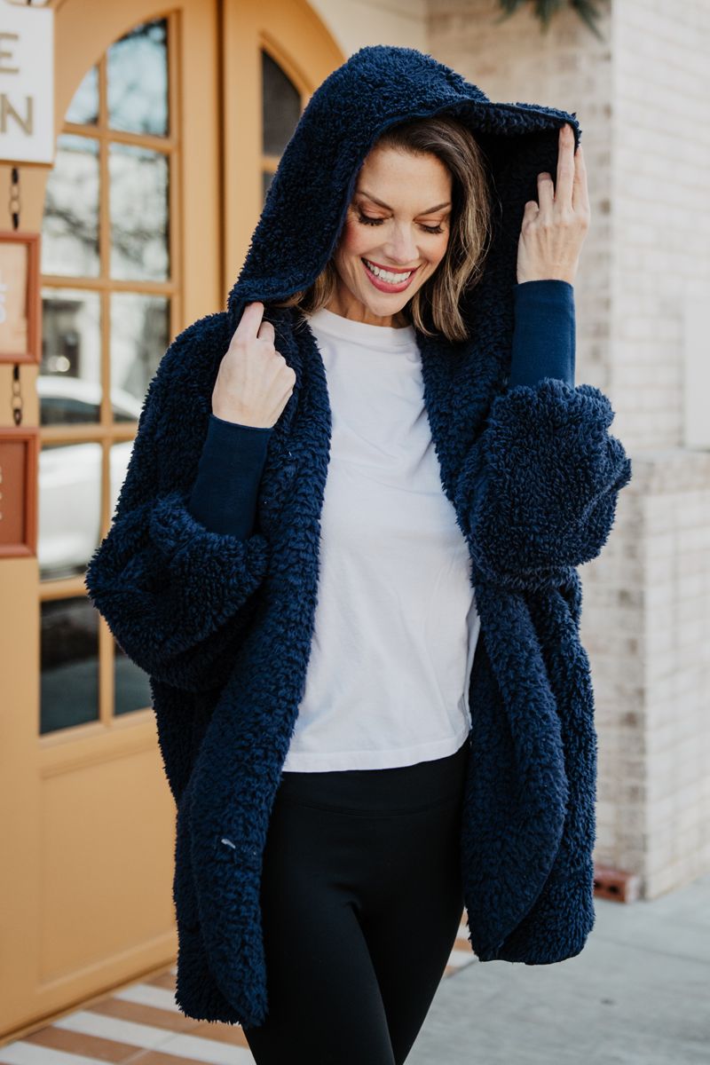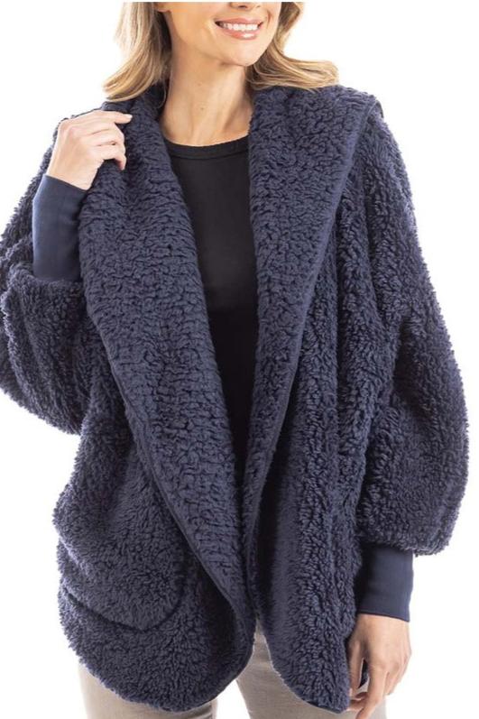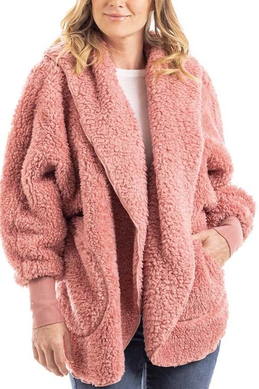 Nuzzle up in this nifty cardigan with hoodie and pockets! Fuzzy. furry and fluffy as can be. it's the hooded sherpa wrap that aligns cuteness with comfort.