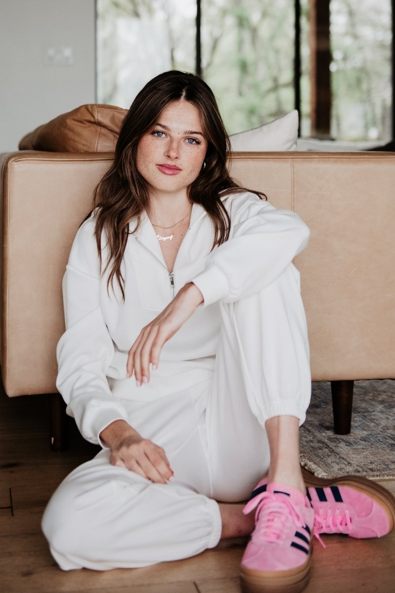 Throw it on with a baseball cap and sneakers for a casual day look or add hoops and a crossbody to elevate it for brunch. The versatility is next level. and the comfort? Chef's kiss. It's your go-to for crisp mornings. slow Sundays. and everything in between. Fall might be all about color. but trust‚ this white set shines.
